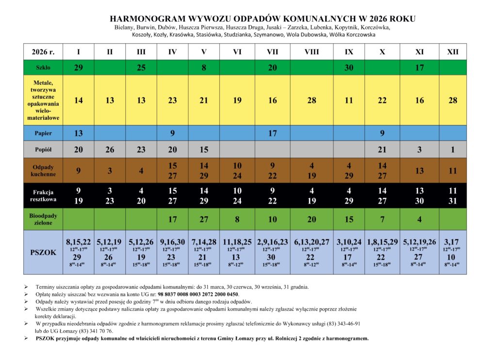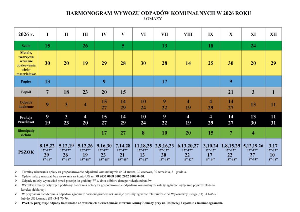 Harmonogram odbioru odpadów 2026 r. - Łomazy